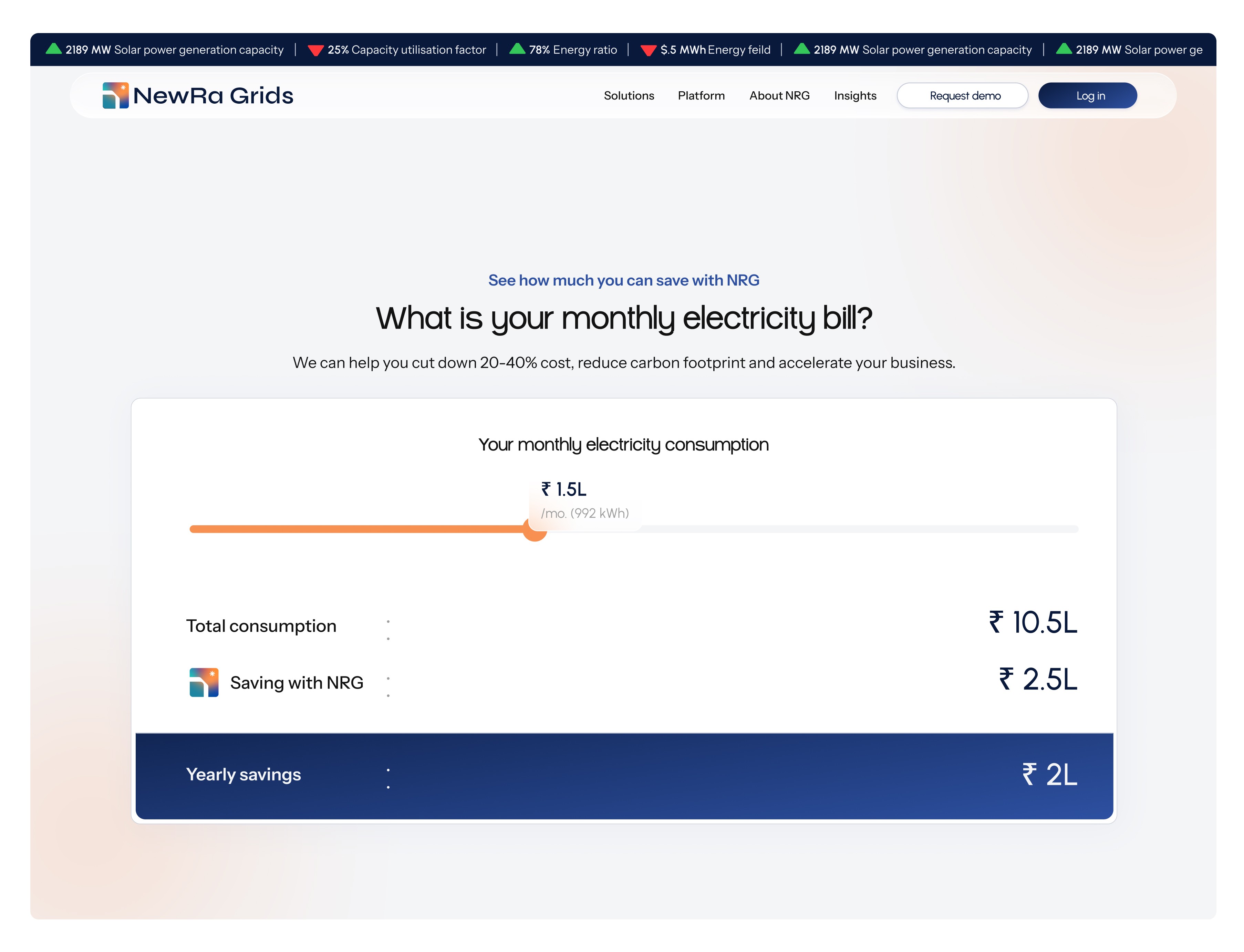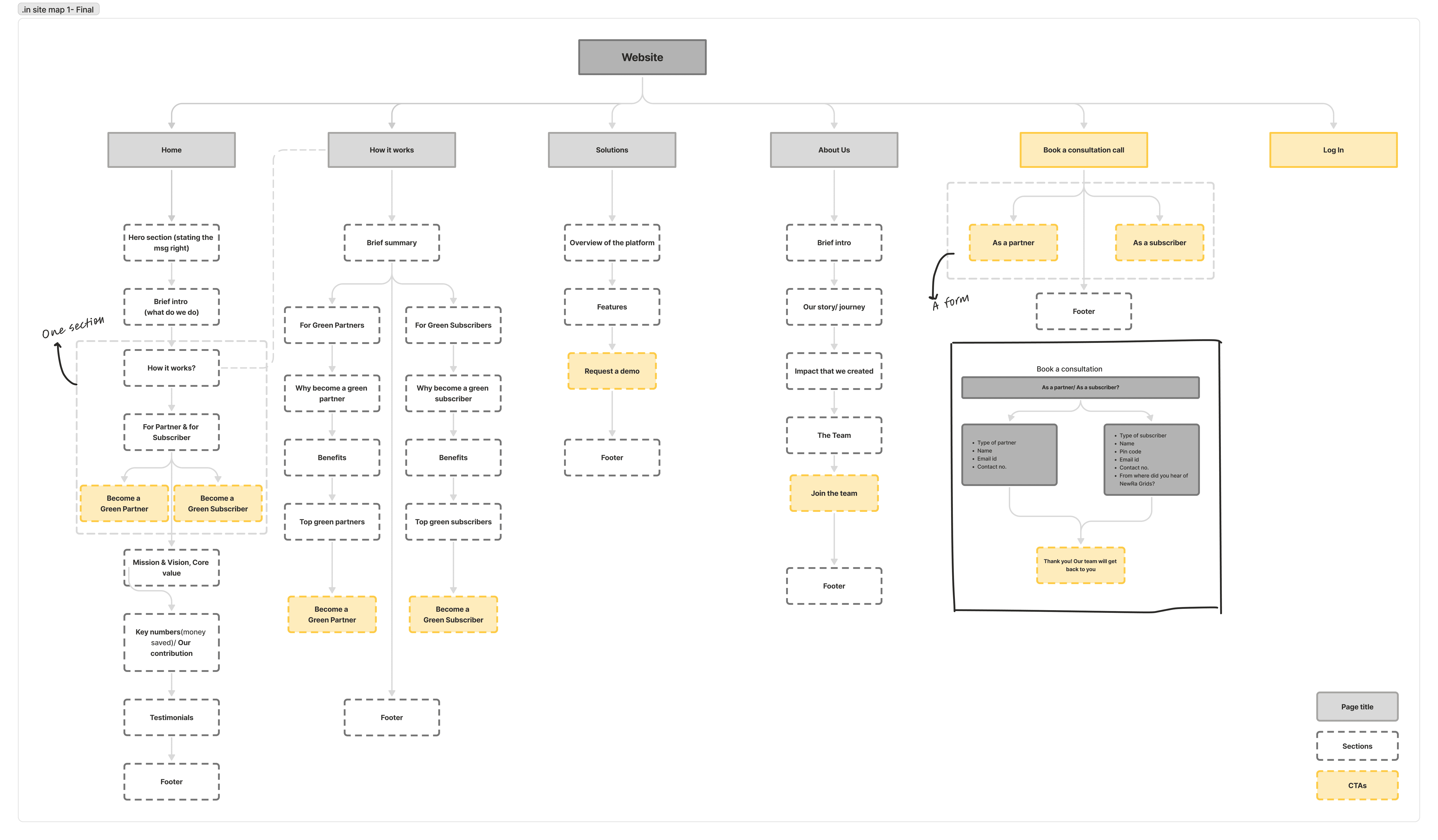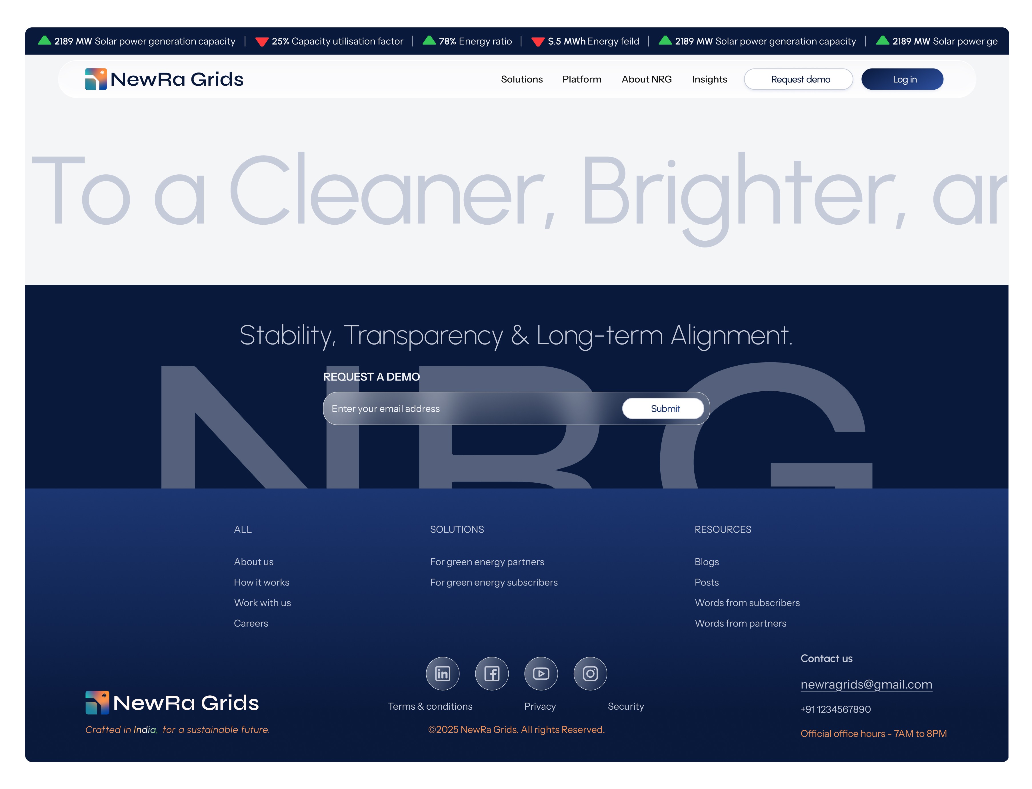 The IA for the website was designed keeping the primary, secondary actions under consideration. The primary action being - when the user wants to become an energy partner or consumer (form) through NewRa Grids, user wants to request demo and contact the team. Secondary action - when the user wants to calculate electricity consumption, learn more about NRG and learn about the platform.