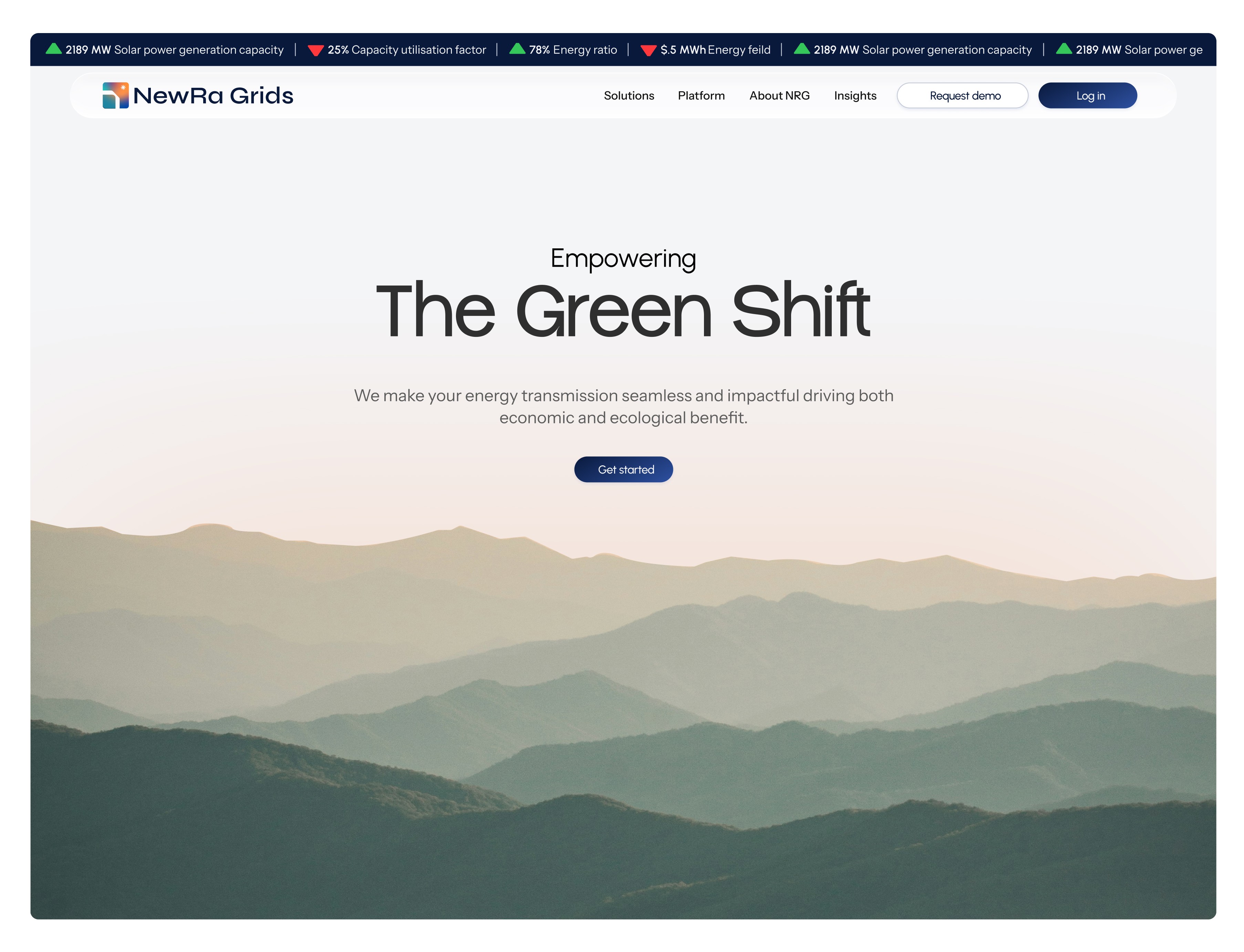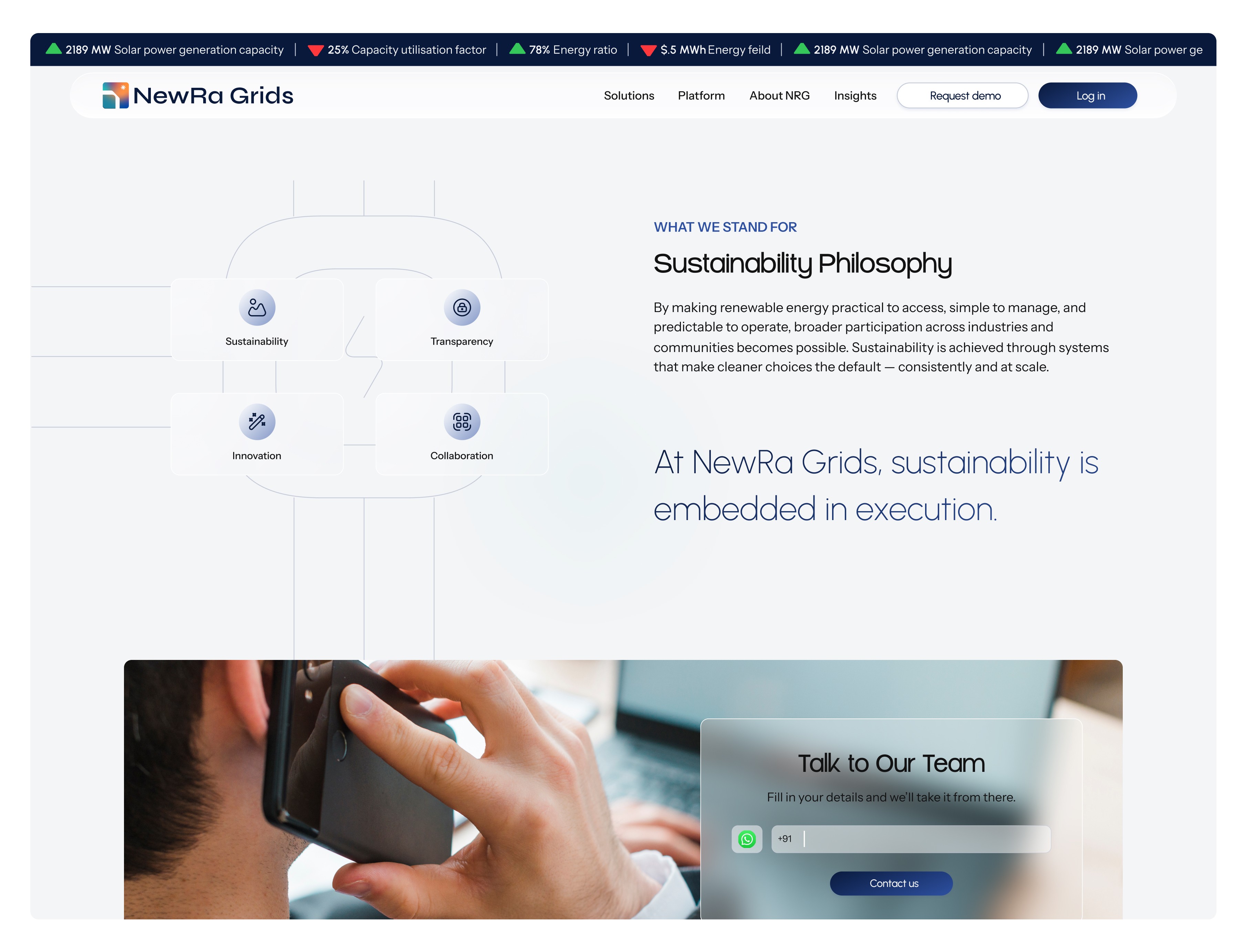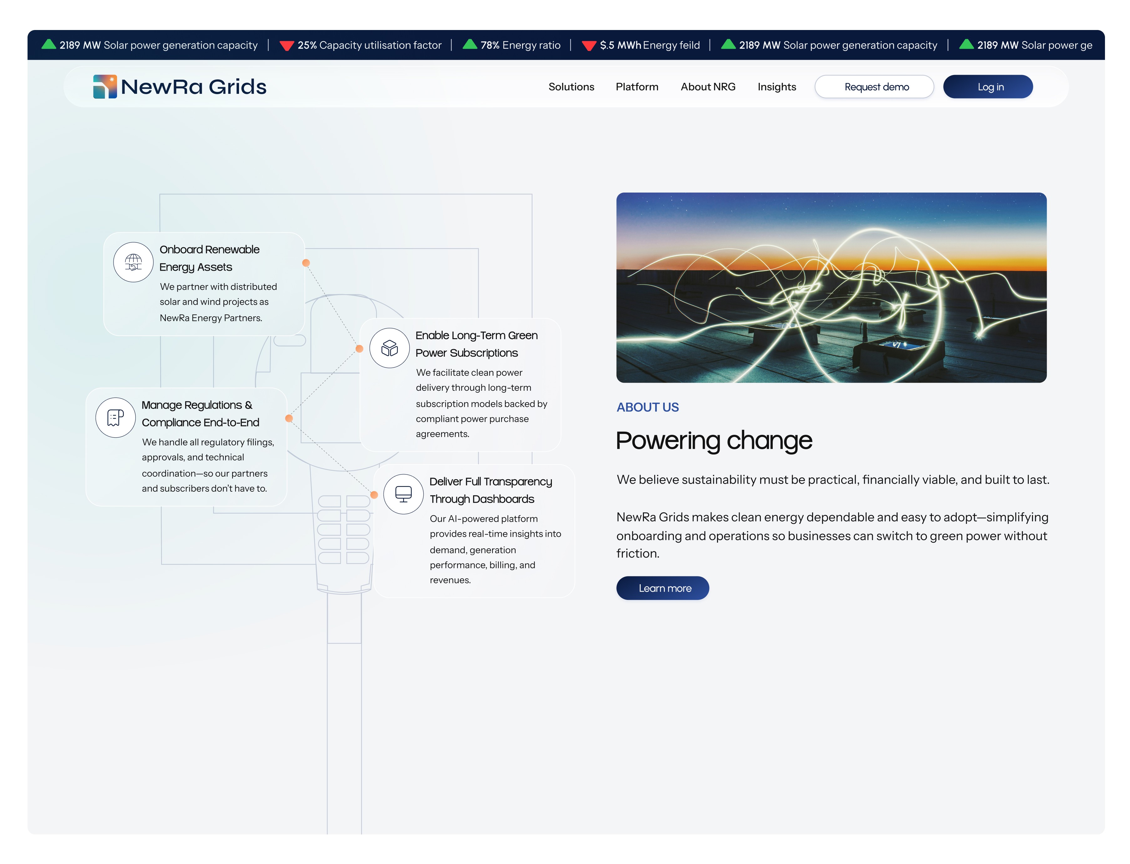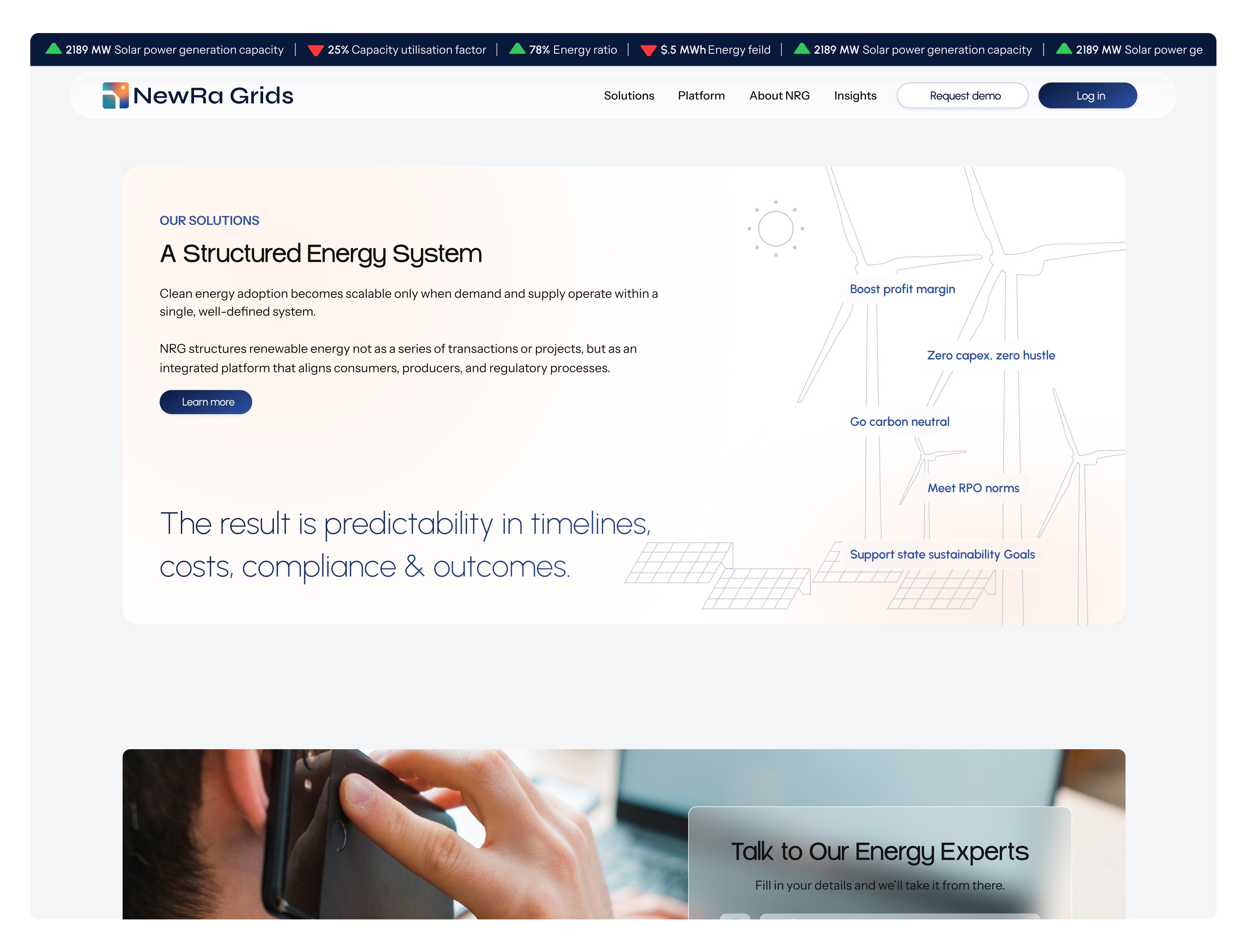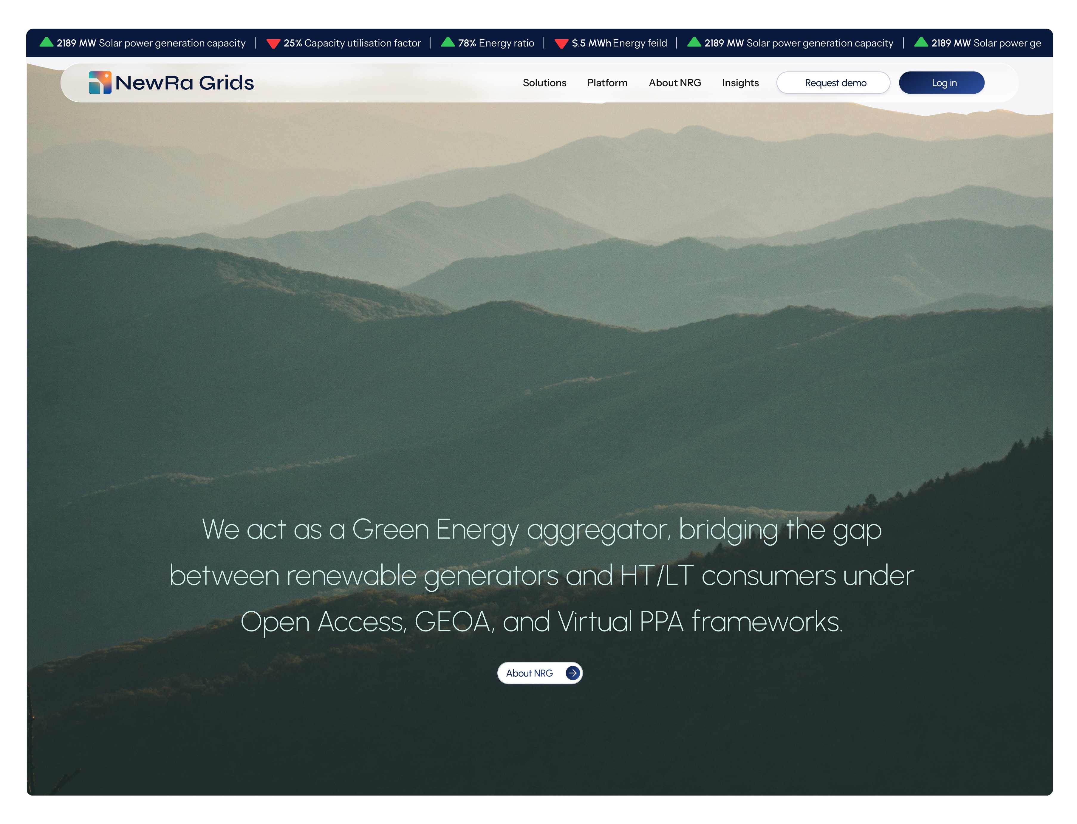 The brief for the UI was that NRG should come across as a tech-focused, futuristic company with human and sustainability touch. The communication should reflect the same. The hero section to have a wow-factor, other sections should be systematically creative and scalable.